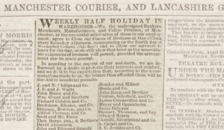 In 1843, a number of young men in the Manchester Athenaeum, led by William Marsden and Robert Lowes, embarked on a campaign to convince the owners of shops, warehouses and factories to reduce the working day on Saturdays, from a whole day, to a half-day ending at 1 pm. This was done without reduction of weekly earnings. They were successful, and a joint document was signed by 440 business owners in September 1843.