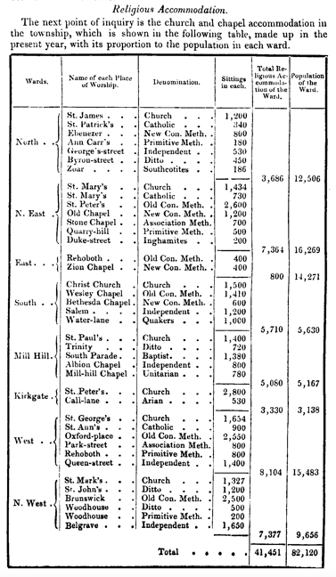 “In dividing the accommodation according to the sects, we see that there are 9 churches belonging to the Establishment, containing 13,235 sittings; 3 Catholic chapels, with 1,970 sittings; 17 Methodist chapels, with 16,340 sittings; 6 Independent chapels, with 6,030; and 5 belonging to other sects, and containing 3,876 sittings.