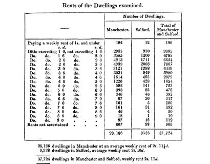 “The great disparity of increase of the three districts under notice [Manchester, Salford, Chorlton] is to be attributed to the centre of Manchester becoming, from year to year, less occupied as family dwellings; for, though its multitude of compact buildings are like a bee-hive by day, yet they are household residences of a very few; the great body of occupiers living in the outskirts, or in the more airy parts of other unions. The comparatively diminished rate of increase in Manchester may, in some degree, be affected by the working classes themselves gradually forsaking their cellar and other confined buildings for the more clean and airy cottages, which have of late years been so numerously built out of the township, as in Chorlton and Hulme. The greater increase in the other two unions are to be accounted for on converse circumstances, – from the inhabitants forsaking the interior of the town, and living in the outskirts; either from views of health, economy, or being displaced from their town dwellings by the extension of warehouses and manufacturing establishments.”