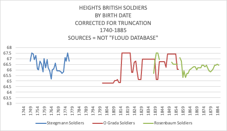 The other complication for the British Army recruits, is that the Army used “minimum height standards” to accept the men, and that these standards were changed from time to time. In Europe, these minima did not change much. Thus it is complicated to calculate consistent yearly average heights for the “recruit-giving class”, that is, the segment of the working class that would be interested in applying for the army, but including those above minimum heights and those below minimum heights, and those physically fit, and those not physically fit. As a final step, the adjusted heights for each year have to be regressed to the data of birth of each recruit, as the theory tells us, that the adult heights are a function of the wage, food, and sanitary conditions in early childhood.