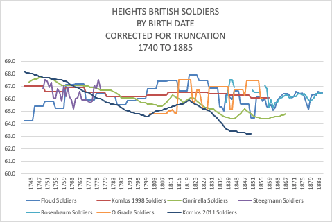 | Komlos 1998 John Komlos; Shrinking in a Growing Economy?, The Mystery of Physical Stature during the Industrial Revolution The Journal of Economic History, Vol. 58, No. 3(Sep. 1998), pp. 779-802; www.jstor.org/stable/2566624 Figure 2, Height of English Soldiers, 20-23 year olds, p. 781. |