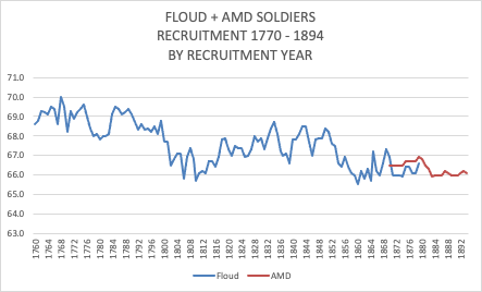 - “Floud Data” of soldiers gives 66.1 ins. for recruitment date 1780 (American War of Independence), 66.0 ins. for recruitment date 1794-1810 (Napoleonic Wars).