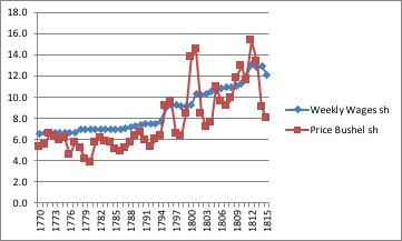 Below we have a first approximation to a comparison of the earnings of the Middle Case family (see below, Absolute Figures as to the Standard of Living), and their cost of living, in terms of the inflation in wheat prices, for the years 1760 to 1825. The earnings include the hay and harvest wages, task-work income, and the earnings of the wife and children, and are taken to be 2.2 times the basic weekly winter wage, averaged over the counties of England. The living costs are equivalent to the price of 2.2 bushels of wheat, including an additional 30 %, which is the difference between the market price for wheat, and the price of the middleman to the labourers. (see Davies, 1795, pp. 33-34).