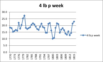 We now show the comparison between the wages and the price of the 4 lbs. of wheat, that is, how many 4 lb. units of wheat could be bought with one week’s wages.