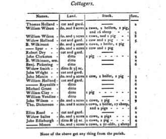 “ …. There are also a great many cottagers, by which I mean, occupiers of small portions of land, just sufficient to enable them to keep one or two cows, without preventing them from working constantly as day-labourers:- this custom does not prevail in all the parishes, but wherever it does, the benefit of it is felt by the cottagers themselves in the greatest degree, and by the proprietors and occupiers of the lands in the lowness of the poor rates, and in the industry and good order of that description of labourers. These small portions of land are generally well managed, and made the most of.”