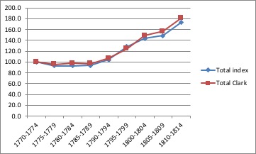 This gives the following index numbers per quinquennium, (1770-1774 = 100), with a comparison against Gregory Clark, who uses 50 % wheat for the whole period.