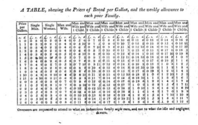 When the Gallon Loaf of Second Flour, Weighing 8lb. 11ozs. shall cost 1s. Then every poor and industrious man shall have for his own support 3s. weekly, either produced by his own or his family’s labour, or an allowance from the poor rates, and for the support of his wife and every other of his family, 1s. 6d.