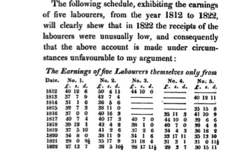 “I have examined the earnings of labourers in several districts, and they accord in a considerable degree with what might be expected form their number, and the sum expended in wages. I have also drawn out tables of their earnings for a series of years, during the present century, in which it appears that the annual earnings of labourers, exclusive of the earnings of their families, exceed on average £ 40 per annum. This is especially the case when they are constantly employed by the same masters, as they would generally be, if master and servant were not set at variance by the present inquisitorial and official interference.”