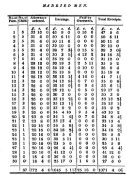 The next table shows the earnings of all the married labourers in the parish. The real wages paid by the farmer are 1045 Pounds, the differences paid in some cases by the parish Overseers are 26 Pounds, and the total incomes of the labourers are 1071 Pounds. Since there are 30 families, the average incomes are 26 Pounds.