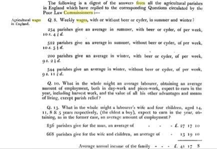 The income of the agricultural families was considerably increased by the earnings of the wife and children. We have a general Report for England from His Majesty’s Commissioners for Inquiring into the Administration and Practical Operation of the Poor Laws, known as the Rural Queries from 1834 (vols. xxx-xxxiv).