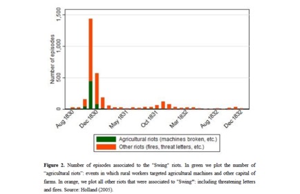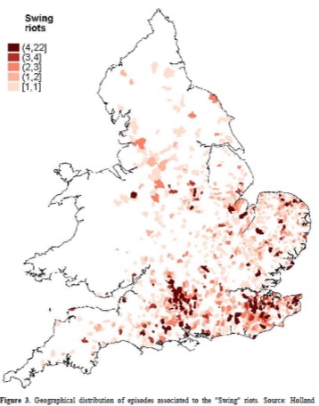 Bruno Caprettini, University of Zurich, Hans-Joachim Voth, University of Zurich and CEPR; Rage against the Machines: Labor-Saving Technology and Unrest in England, 1830-32, January 2017; http://www.idep.eco.usi.ch/caprettini-320265.pdf, p. 33, taken from Holland, Swing Unmasked, 2005