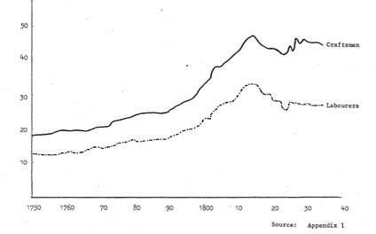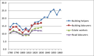 We see that the nominal wages increase continuously from 1780-9 to 1810-9, and remain practically without movement to 1860-9. The real (corrected for inflation) wages remain stable from 1780-9 to 1810-9, and then improve by 50 % to 1860-9. This is arithmetically due to the increases in the price of food (especially corn) in the first period, and the decreases in the second period. It is not clear why there is such an improvement from 1810. These are workers with basic skills, and with not much individual bargaining power. Apparently the “trick” was to retain their nominal daily wage amounts from 1810, even while the cost of living was diminishing. If they did receive these increases, we would have to suppose that all the non-skilled working class also experienced this amount of movement, otherwise the building workers would “leapfrog” over them.