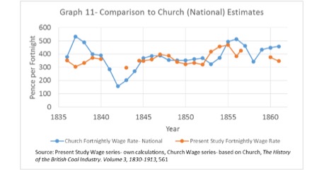 It was generally accepted that the male miners had a high wage level and deserved it, due to the dangerous and physically tiring nature of their work, as well as the exactness with which they had to work. Their wages were about twice those of the agricultural labourers in the same region, additional to which they could take coals home for own use, and in some coalfields the married men could live in cottages rent-free. In the majority of families two sons of from 12 to 18 years old worked in or above the mine, which increased the family income by 100 %. In the long term the wages did reflect the movements in the agricultural wages (see the graph below, for the relationship in the Northumberland and Durham coalfield, which was the largest), although it is not clear if the miners’ wages were moved by the labourers’ wages, or vice versa.