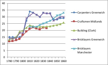 With reference to carpenters and bricklayers, we have continuous data from 1780 to 1860, from the contract prices of Greenwich Hospital. The wages are practically constant for the period 1780 to 1800, they are suddenly doubled in 1800, and then maintain this level until 1860. We might think that that this was due to a change in contractual conditions in the works in Greenwich, and thus not representative of the whole country. However there are similar movements in Macclesfield for joiners and bricklayers of 33 % from 1793 to 1815, and then without changes to 1838.