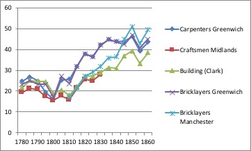From the study by Clark, we give the table for 1780-9 to 1860-9, for skilled building craftsmen: