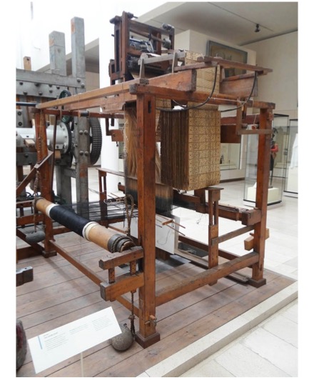Jacquard silk loom, 19th century, Stonehouse, Lanarkshire (the control cards are hanging down in front); National Museums Scotland, Science and Technology; http://www.nms.ac.uk/explore/stories/science-and-technology/jacquard-loom/