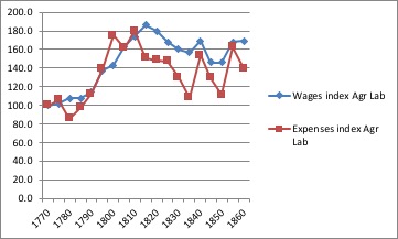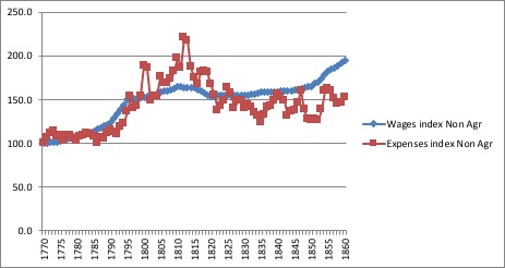 The comparisons between the wages indices and the expenses indices give the following results. (In all cases, in the five-yearly data, the figures for 1840 and for 1855 are not representative of the general trend, as exactly these years had abnormal inflation; the recommendation is to mentally draw a straight line from 1835 to 1845, and another from 1850 to 1860.)