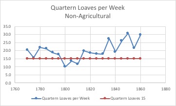 Possibly the most interesting method for showing the movements in the incomes and expenses of the workers, is to compare the average weekly wage with the cost of 15 quartern loaves (approx. corresponds to one bushel of wheat). The cost of one bushel of wheat – or a little less – was taken to be enough to cover the normal expenses of a family.