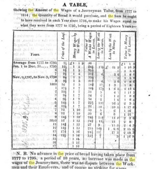 The earnings for 1777 to 1795 were 22s. a week, equivalent to 36 loaves; in 1800, 25s., equivalent to 18 loaves; in 1802, 27s., equivalent to 31 loaves; in 1810, 33s., equivalent to 24 loaves; and in 1814, 36s., equivalent to 35 loaves.